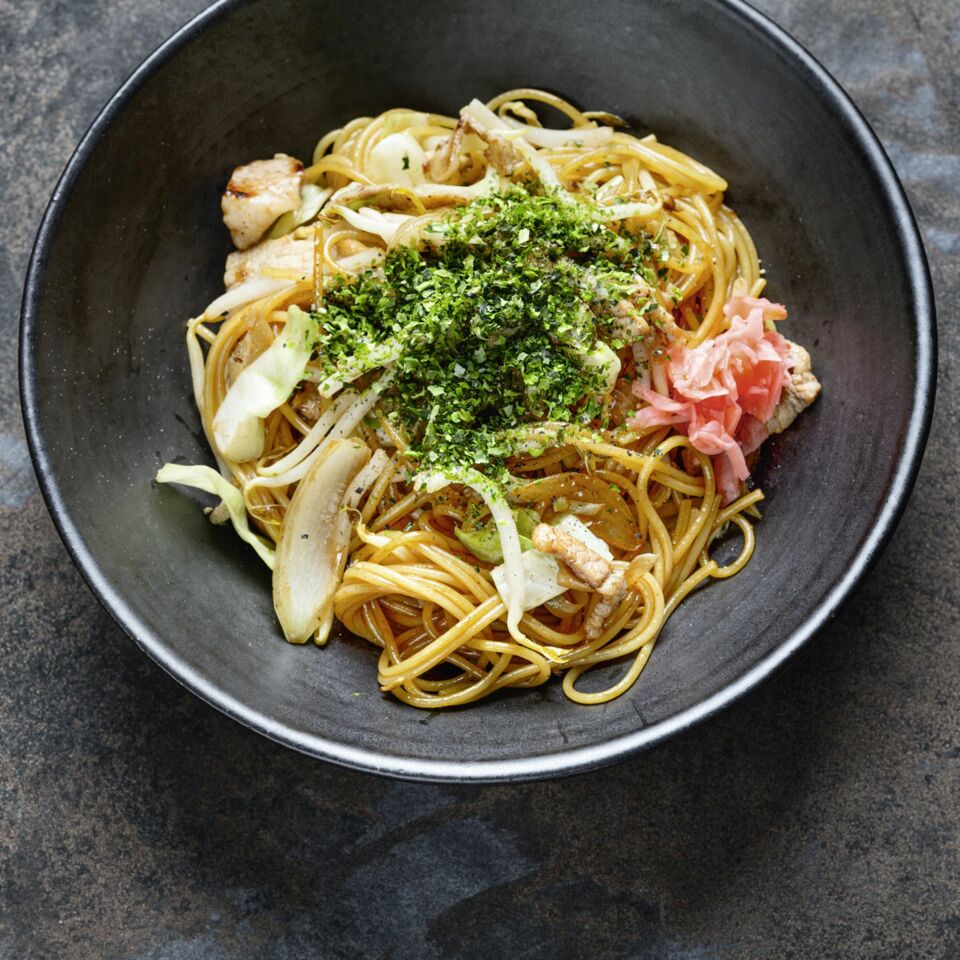 Das restliche Öl (1 EL) in einer beschichteten Pfanne erhitzen. Das Fleisch bei mittlerer Hitze darin anbraten. Die Kohlstreifen hinzufügen und ca. 3 Min. mitbraten. Alles aus der Pfanne nehmen und die Spaghetti darin anbraten. Die Sauce mit kreisenden Bewegungen darübergießen, die Spaghetti damit vermengen. Dann Fleisch und Kohl in die Pfanne zurückgeben, Sojasprossen hinzufügen und alles unter gelegentlichem Rühren erhitzen. Mit Salz und Pfeffer abschmecken. Das Yakisoba auf Tellern anrichten. Mit den Aonori-Algenflocken bestreuen und mit dem eingelegten Ingwer servieren.