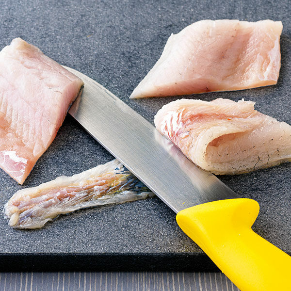 Die Zanderfilets unter fließend kaltem Wasser abwaschen und mit Küchenpapier trocken tupfen. Die Filets quer in drei Stücke teilen. Das schmale Endstück von der hinteren Seite her zur Hälfte enthäuten und den enthäuteten Bereich auf die Innenseite klappen. So ist dieses Filetstück etwa genauso dick wie die anderen.