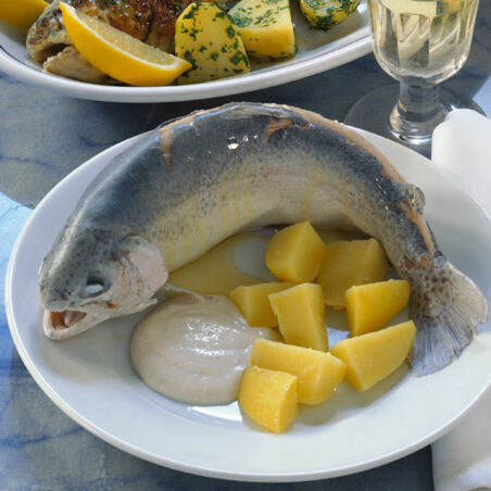 Die zart gekochten Forellen liefern herzgesunde Omega-3-Fettsäuren und viel wertvolles Eiweiß. Als Getränk reicht man dazu am besten einen trockenen Weißwein.