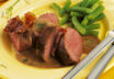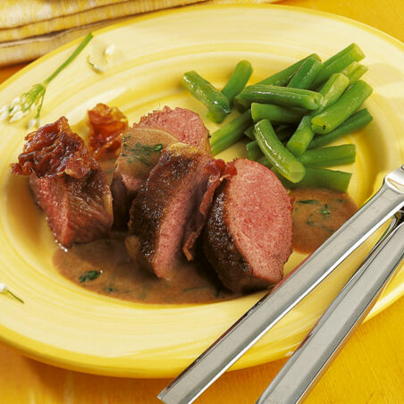 Ofen auf 180° vorheizen. Fleisch salzen und pfeffern. Im Bräter im restlichen Öl anbraten. Mit der Fleischseite nach oben, mit dem Speck belegt, 30 Min. geschlossen (unten, Umluft 160°) garen.