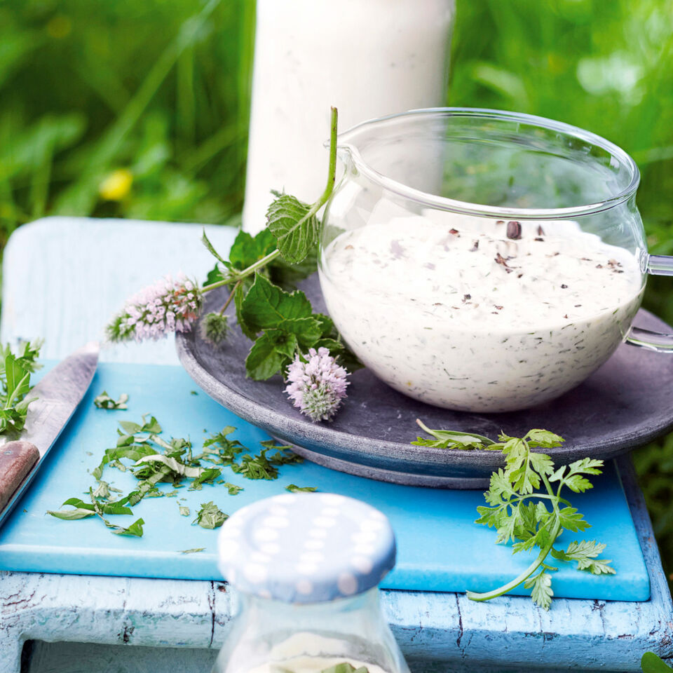 Das Ziegenfrischkäse-Dressing ist ganz einfach und schnell zuzubereiten und passt außer zu Blatt- und Gemüsesalaten auch zu Ofengemüse.