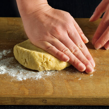 Das Mehl mit dem Salz auf die Arbeitsfläche geben. Eine Mulde in die Mitte drücken und das Ei hineinschlagen. Die Butter klein würfeln und alles schnell zu einem glatten Teig verkneten. In Klarsichtfolie wickeln und 30 Min. im Kühlschrank ruhen lassen.