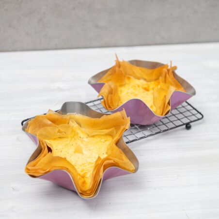 Backofen auf 160°C Umluft vorheizen. 6 Blätter des Filoteiges übereinanderlegen und in vier gleichgroße Teile schneiden. Jeweils die sechs Blätter einzeln in die Formen legen und jede Schicht mit etwas Butter einpinseln.