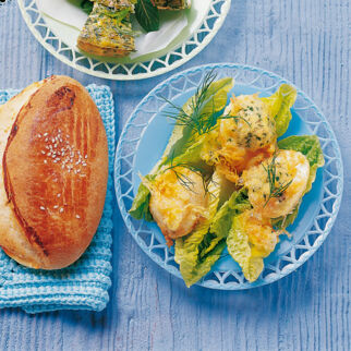 Den Schafkäse mit der Gabel fein zerdrücken. Die Kräuter waschen, trockenschütteln und die Blättchen fein hacken, unter den Käse mischen.