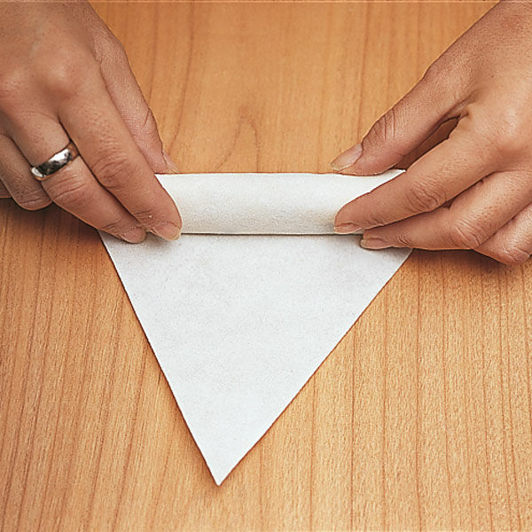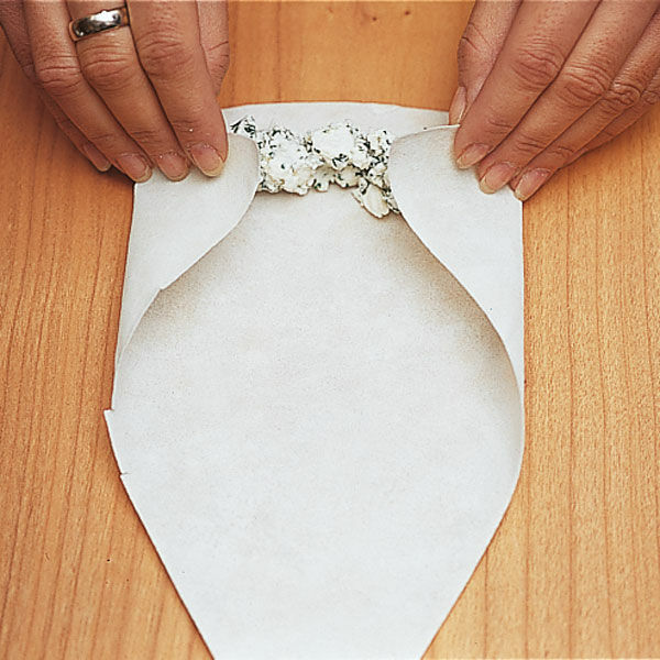 Ein Tellerchen mit kaltem Wasser bereit stellen. Auf die abgerundete Basisseite jedes Dreiecks je 1 TL Käse legen, die Ecken rechts und links leicht darüber klappen. Die Dreiecke wie Zigaretten bis zur Spitze hin fest aufrollen.