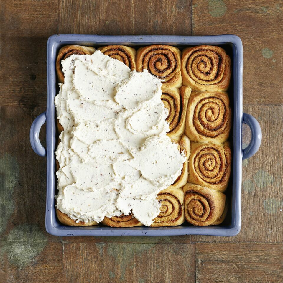 Die Schnecken herausnehmen und mindestens 1 Std. abkühlen lassen. Das Frosting darauf verteilen. Das Gebäck gleich zum Adventskaffee bei Freunden mitbringen und genießen.