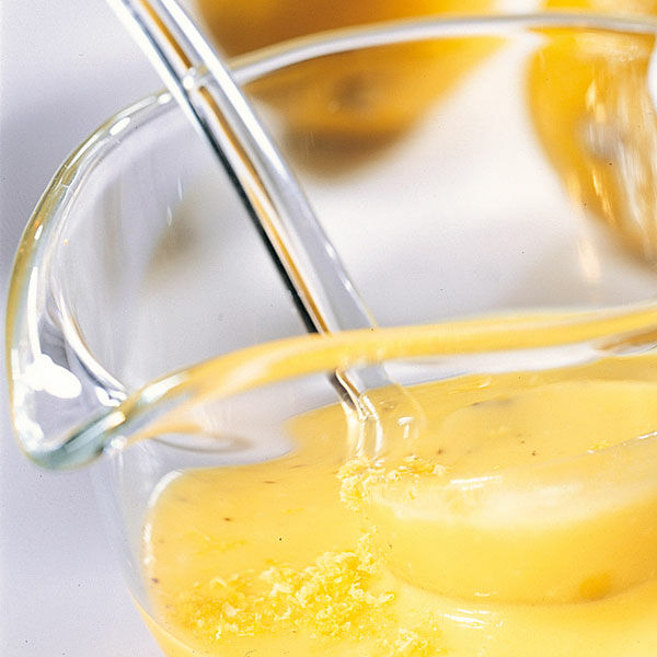 Die Schale der Zitrone heiß waschen, abreiben, Saft auspressen. Beides mit dem Senf verrühren, leicht salzen und pfeffern.