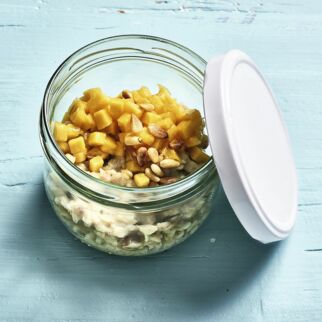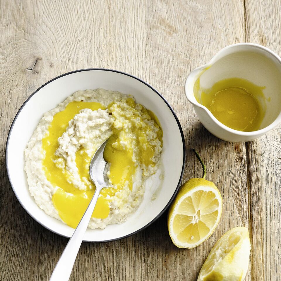 Dieser Milchreis wird mit Haferdrink zubereitet, wodurch er vegan ist. Zitronensaft und Mangopüree sorgen für eine fruchtige Note.