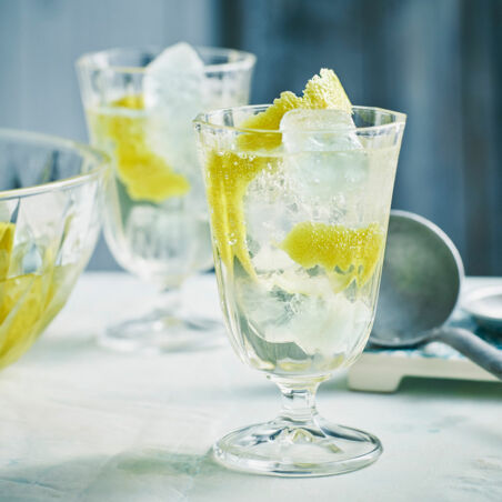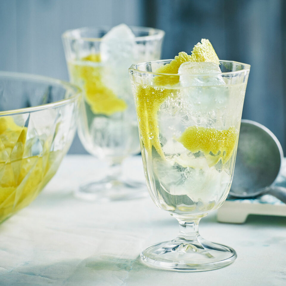 Die Zitronen auspressen und den Saft durch ein feines Sieb zum Zitronenwein gießen. Restlichen Wein und den Prosecco aufgießen, die Eiswürfel dazugeben und die Bowle servieren.