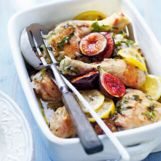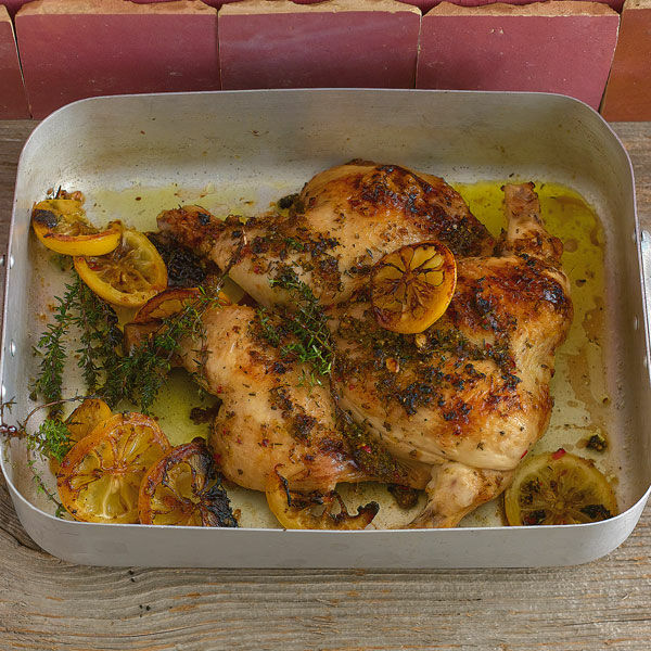 Den Backofen auf 180° vorheizen. Das restliche Olivenöl über die Poularde träufeln, etwas salzen. Die zweite Zitrone in Scheiben schneiden, zu der Poularde geben. Im Ofen (unten, Umluft 160°) 1 Std. 30 Min. garen, dabei öfter mit dem austretenden Bratensaft begießen. Die Poularde zerteilen und mit Thymian garnieren.