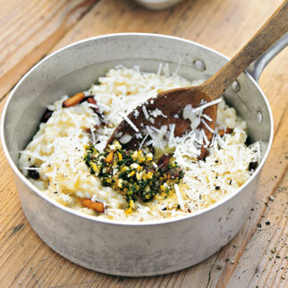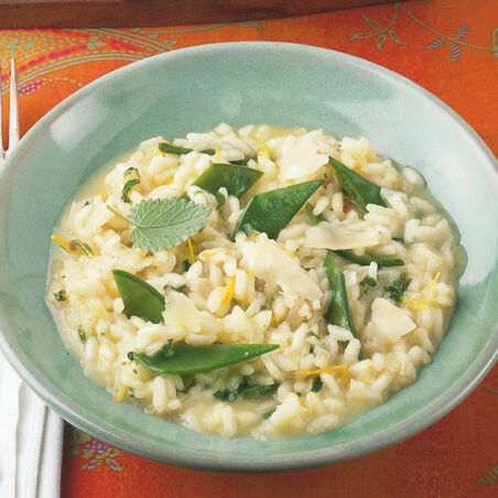 Nach 15 Min. Garzeit die Zuckerschoten unter den Reis rühren und weitere 5 Min. köcheln lassen. Nun sollten Sie probieren: Der Reis muss noch Biss haben, darf aber nicht hart sein. 3 EL Zitronensaft, die -schale, Melisse, Butter und Parmesan unterrühren und mit Salz und Pfeffer abschmecken.