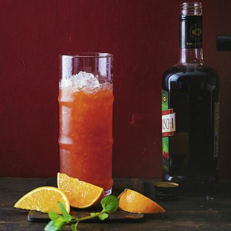 Das Cocktailglas zur Hälfte mit gestoßenem Eis füllen und den Inhalt des Shakers durch das Barsieb hineingießen. Den Minzestängel ins Glas stecken und den Cocktail mit der Orangenspalte dekorieren. Sofort mit dem Trinkhalm servieren.