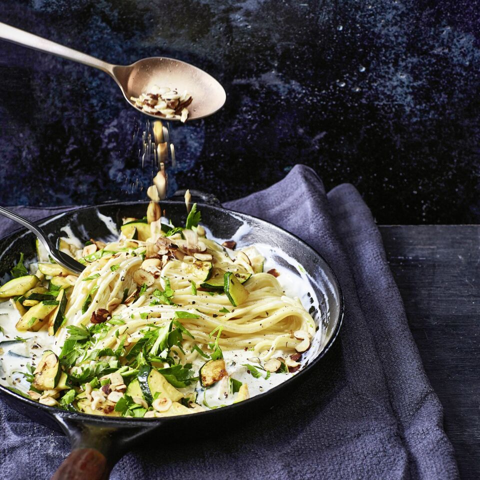 Die Nudeln in ein Sieb abgießen und abtropfen lassen, dabei das Kochwasser auffangen. 3 EL Kochwasser mit dem Ziegenkäse verrühren. Die Nudeln zu den Zucchini in die Pfanne geben, Ziegenkäse-Creme, einen Teil Petersilie und Nüsse dazugeben und alles mischen. Falls nötig, noch etwas Kochwasser unterrühren. Auf Teller verteilen und mit übriger Petersilie und Nüssen bestreuen.