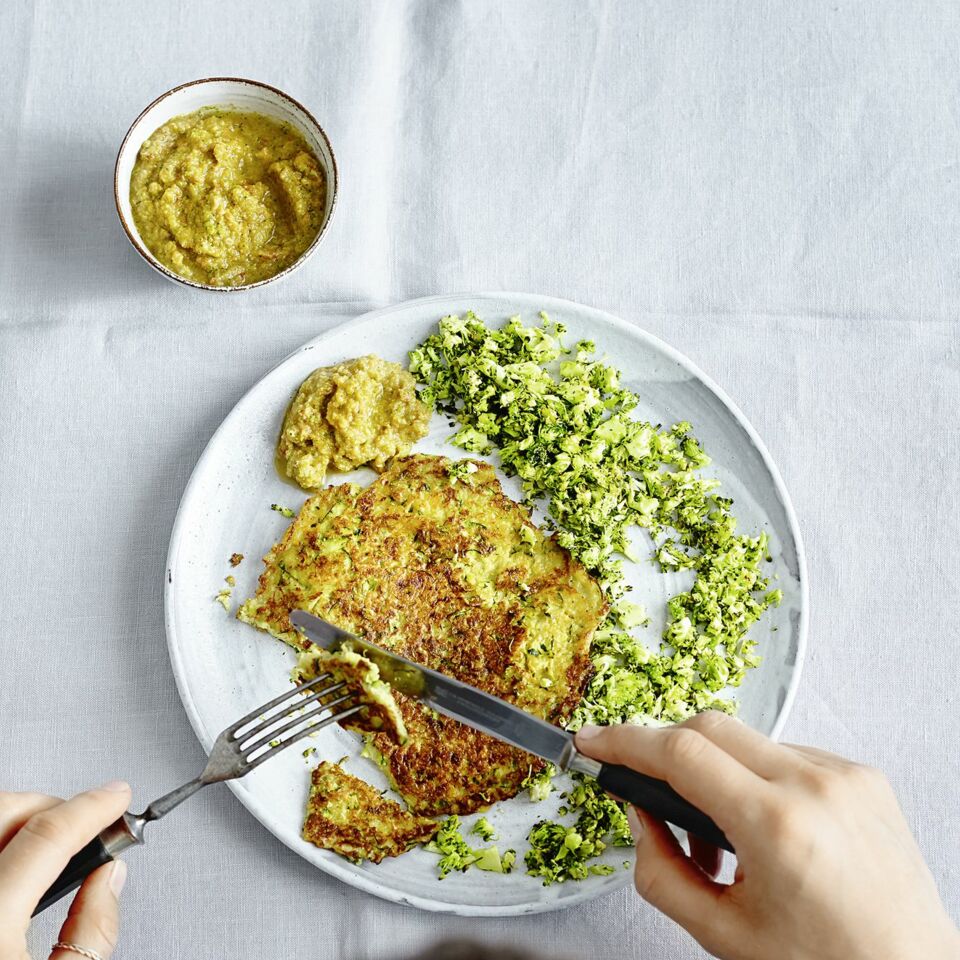 Mit diesen Protein-Pancakes lacht dir die Sonne vom Teller zu! Und der Brokkoli-Reis ist Low Carb. Perfektes gesundes Mittagessen.