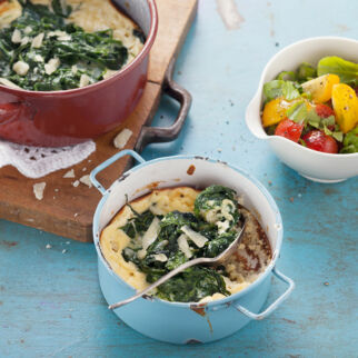 Mmh, wie es aus dem Ofen duftet: Schinken, Tomatensauce und eine schnelle Parmesancreme kommen mit Gemüsescheiben statt Nudeln in die Form.