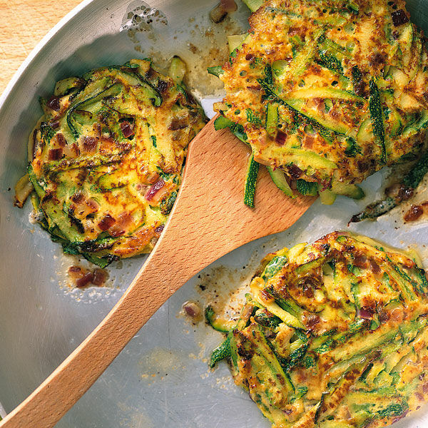 Eier, Mehl und Pfeffer verquirlen. Zucchini mit Küchenpapier fest ausdrücken, mit den Zwiebeln einrühren. Semmelbrösel unterheben, salzen und pfeffern. Öl in der Pfanne erhitzen. Kleine Teigportionen hineinsetzen und in 5-7 Min. knusprig braten. Auf Küchenpapier entfetten.