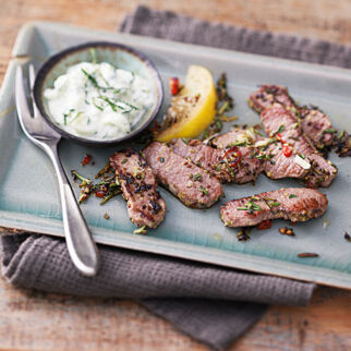 Die Zucchini mit Küchenpapier trocken tupfen. Auf jede Zucchinischeibe im unteren Drittel mittig etwas Käsecreme geben und die Scheiben fest aufrollen. Die Röllchen auf dem heißen Stein in ca. 5 Min. rundherum braun braten.