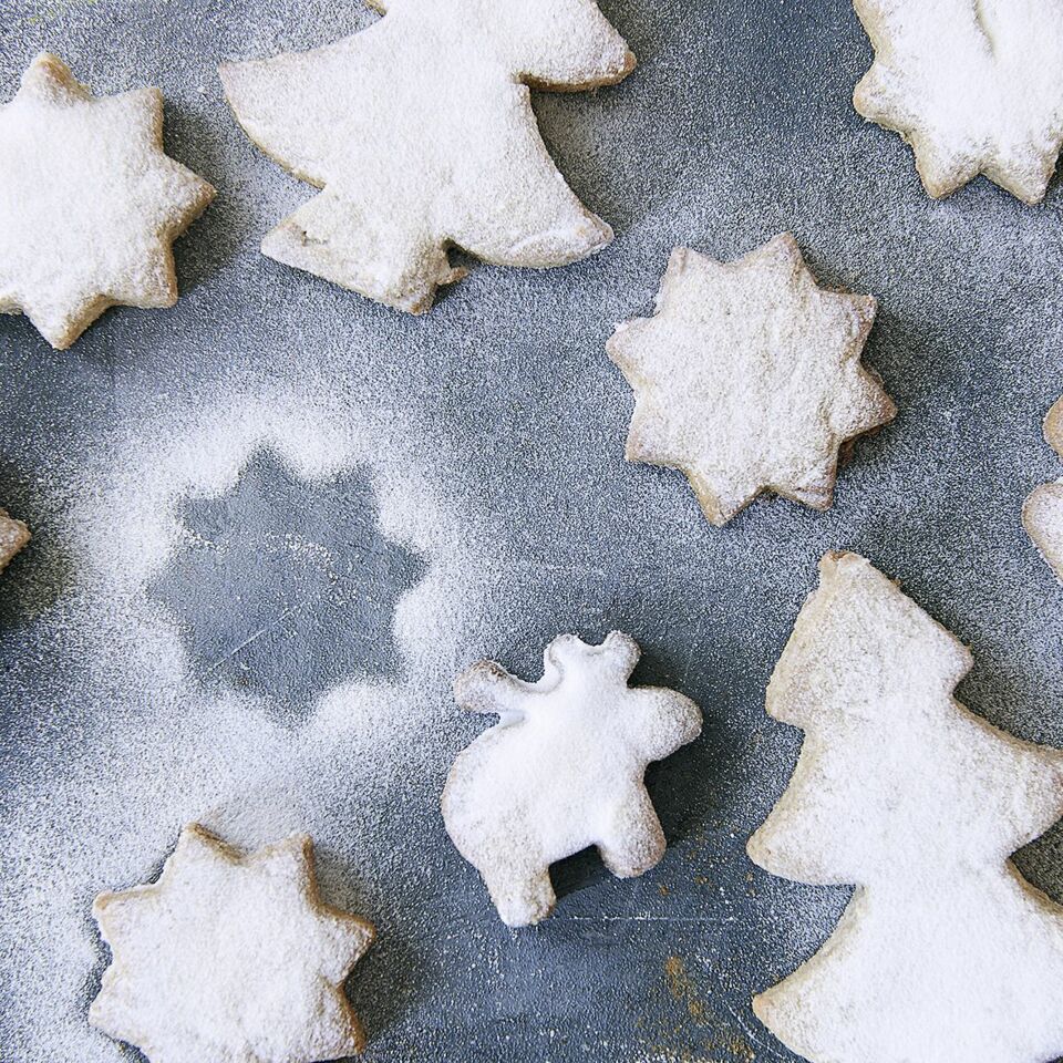 Teig auf einer bemehlten Arbeitsfläche durchkneten und ca. ½ cm dick ausrollen. Mit den Ausstechformen Kekse aus dem Teig ausstechen (z. B. Tannenbäume, Engel oder Elche) und auf das Blech legen. Im Ofen (Mitte) 12-15 Min. backen. Herausnehmen und aus-kühlen lassen, dann mit Reissüße bestäuben.