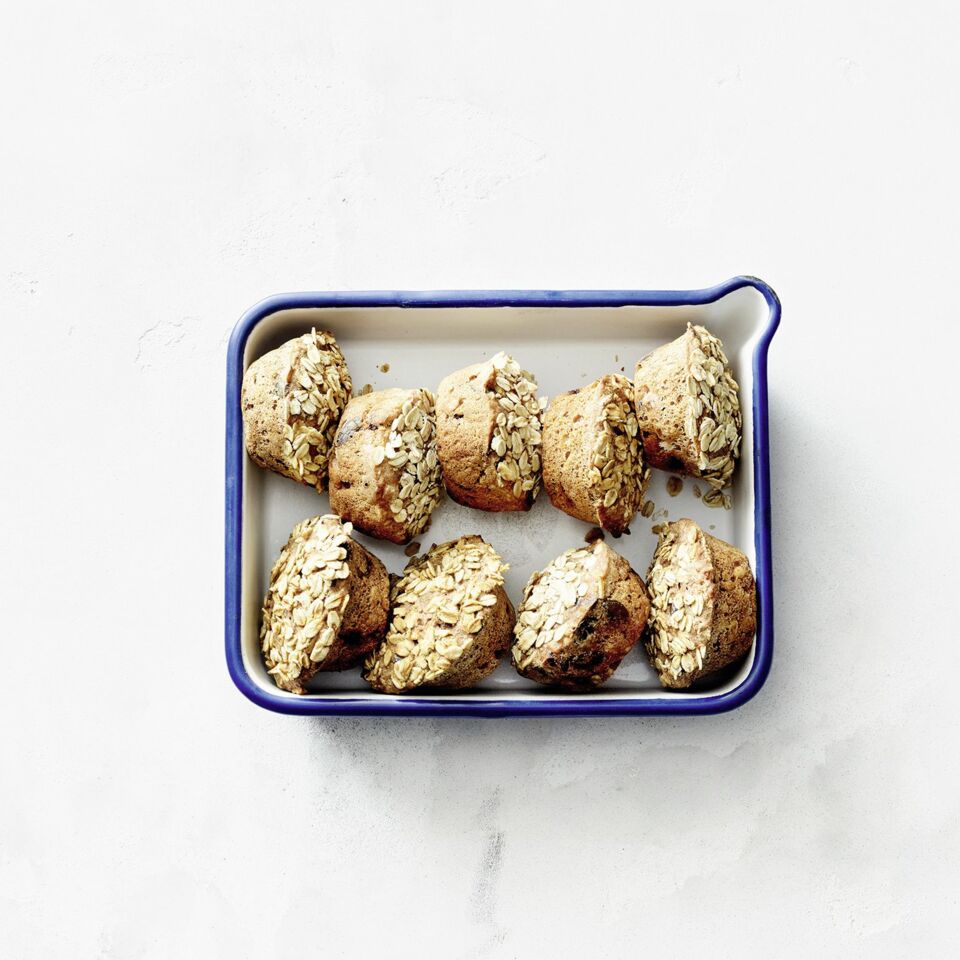 Den Teig mithilfe eines Esslöffels in die Mulden der Muffinform füllen. Die Muffins mit den restlichen Haferflocken bestreuen und im Ofen (Mitte) in ca. 30 Min. goldbraun backen. Dann herausnehmen, kurz abkühlen lassen und aus der Form lösen.