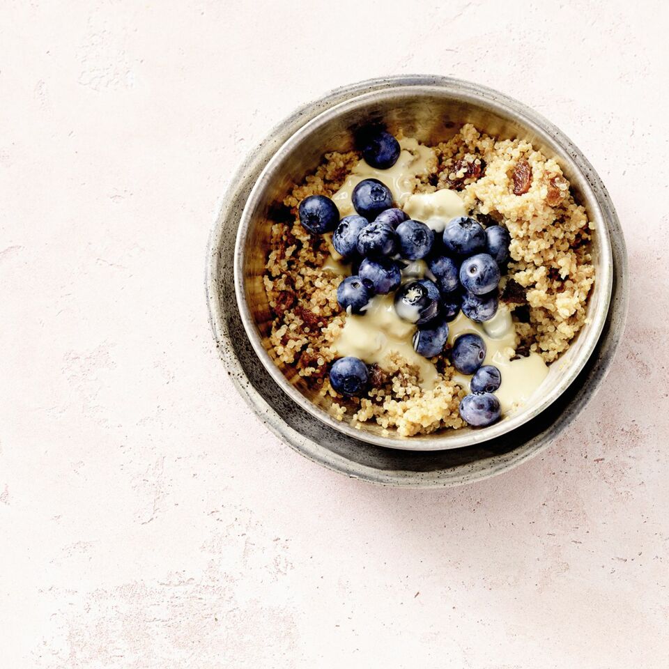 Währenddessen die Heidelbeeren verlesen, waschen und trocken tupfen. Rosinen und Zimt unter die fertig gegarte Quinoa heben.