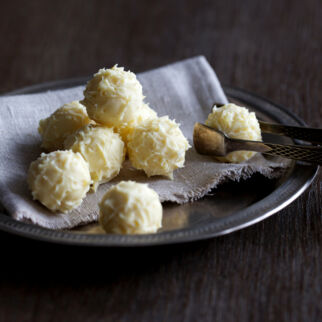 Weiße Kuvertüre hacken, schmelzen und temperieren. Restliche Mandelsplitter untermischen und in 25 Portionen auf Backpapier setzen. Ca. 2 Std. fest werden lassen.