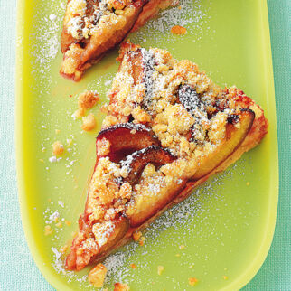 Den krümeligen Teig auf den Zwetschgen verteilen und den Crumble im Ofen (Mitte) 25-30 Min. backen.