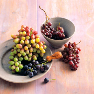 Die Zwetschgen und Weintrauben waschen. Die Zwetschgen halbieren, entsteinen und in schmale Spalten schneiden. Die Weintrauben nach Belieben halbieren. Zwetschgen und Weintrauben in eine Salatschüssel geben.