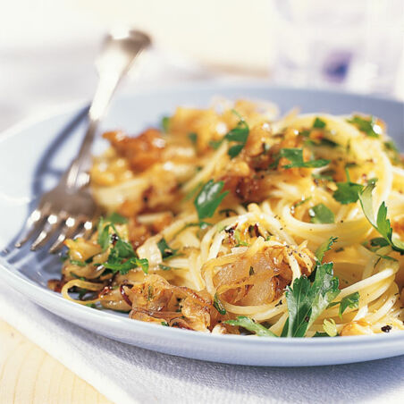 Petersilie waschen, trockenschütteln und grob hacken. Mit der Zwiebelmischung unter die frisch gekochten Nudeln mischen.