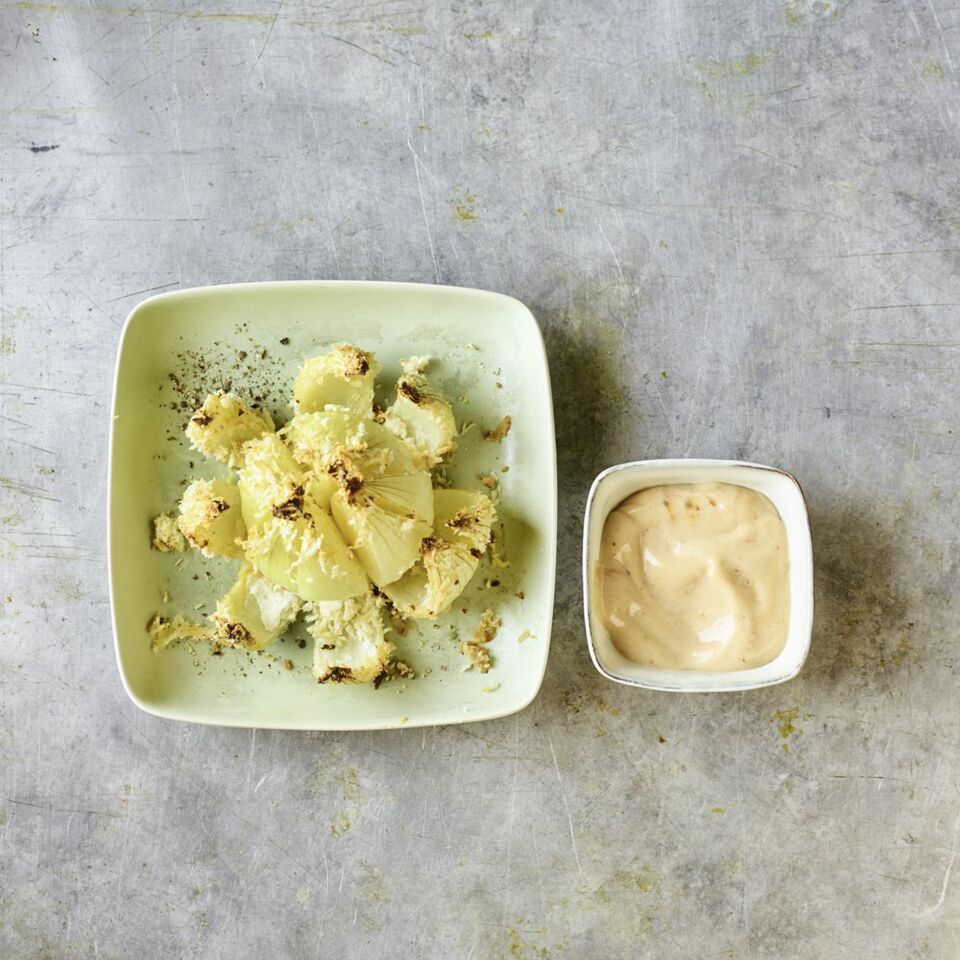 Zwiebeln schälen, den Wurzelansatz nicht entfernen. Zwiebeln viermal über Kreuz tief einschneiden. Eier, Salz, Pfeffer und Paprika verquirlen. Parmesan reiben, mit Panko mischen. Ofen auf 200° vorheizen. Zwiebelschichten leicht auseinanderdrücken, mit Mehl bestäuben, Mehl abklopfen. Zwiebeln durch die Eier ziehen, leicht auseinanderdrücken. Abtropfen, im Pankomix wenden und auf ein mit Backpapier belegtes Blech setzen. Mit übrigem Panko bestreuen. Mit je 1 EL Öl beträufeln. Im Ofen (Mitte) 25-30 Min. backen. Mayonnaise, Joghurt, BBQ-Sauce, Salz und Pfeffer verrühren. Zu den Zwiebeln servieren.