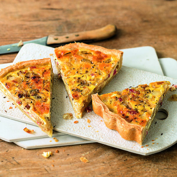 Backofen auf 200° vorheizen, Form einfetten. Den Teig auf der bemehlten Arbeitsfläche ausrollen und in die Form legen, dabei einen Rand formen. Zwiebelmasse auf dem Teig verteilen und den Speck darüberstreuen. Den Zwiebelkuchen im Ofen (Mitte) in ca. 35–40 Min. goldgelb backen. Vor dem Anschneiden etwas abkühlen lassen.