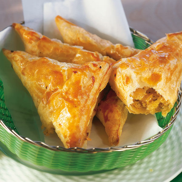 Den aufgetauten Blätterteig auf wenig Mehl zu einer Platte von ca. 25 x 25 cm ausrollen und diese in vier Quadrate teilen. Jeweils ein Viertel der Füllung in die Mitte jedes Quadrats setzen. Das Eigelb verquirlen und die Teigränder damit bestreichen. Die Teigstücke zu Dreiecken zusammenklappen, dabei die Ränder gut andrücken. Die Taschen auf ein mit Backpapier ausgelegtes Blech setzen und mit dem restlichen Eigelb bepinseln. Im heißen Ofen (Mitte) 10-15 Min. backen, bis die Oberfläche goldbraun ist. Kurz abkühlen lassen und servieren.