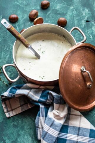 Nun erhitzt du Butter oder Butterschmalz in einem Topf und brätst darin zuerst das Gemüse für 1 Minute bei mittlerer Hitze an. Dann kommen die Maronen dazu sowie Gemüsebrühe und (nach Belieben) Milch oder Sahne – damit wird es eine besonders sämige Cremesuppe.