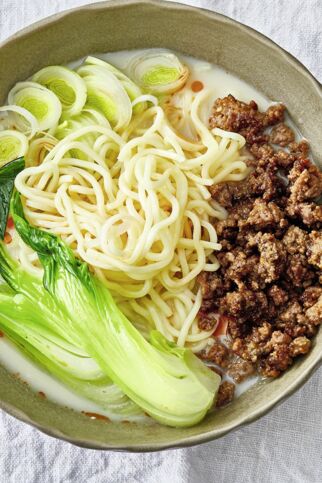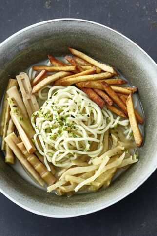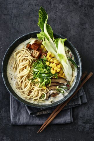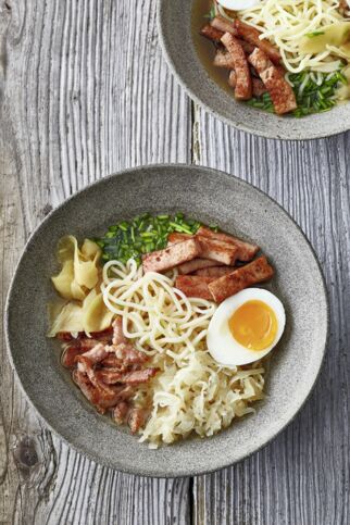Die fettigste, aber auch cremigste Variante ist Tonkotsu-Ramen. Die Japaner bereiten mit kochendem Wasser aus Schweineknochen, Schweineschwänzen und -füßen eine Brühe. Neben dem Fett befindet sich deshalb viel Gelatine in der Suppe.