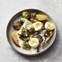 Rosenkohl-Kartoffel-Auflauf mit Birnen-Walnuss-Sprinkle