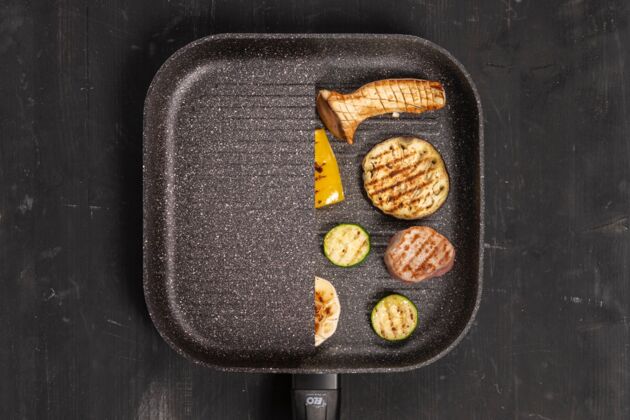Grillpfannen erkennst du an den typischen Rillen am Pfannenboden. Diese sorgen einerseits für das typische Grillstreifen-Muster auf Gemüse und Fleisch und haben andererseits den Vorteil, dass das Grillgut nur auf den Rillen aufliegt und das Öl oder Fett in die Zwischenräume fließt. So kannst du Gemüse, Fleisch oder Fisch schön anbraten und es köchelt nichts im eigenen Saft vor sich hin.