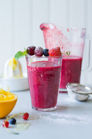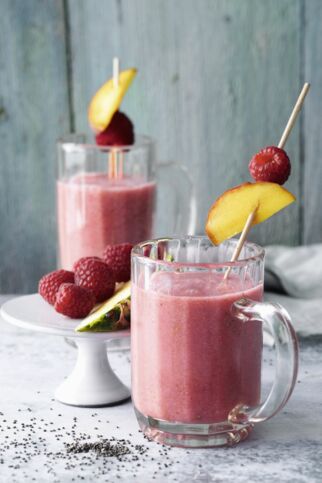 50 g Himbeeren | 1⁄4 l frisch gepresster Orangensaft | 2–3 EL Quark | Zucker nach Geschmack (wenn überhaupt) | 2 Eiswürfel