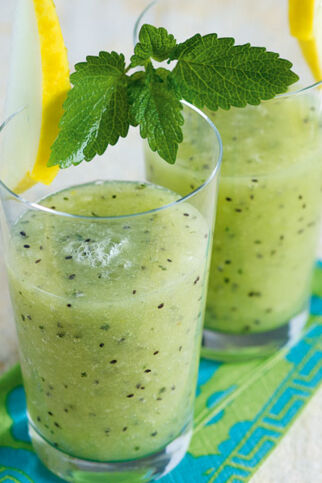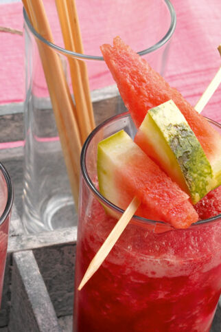 250 g Melonenfruchtfleisch (ohne Kerne; z. B. Charentais-, Galia- und/oder Wassermelone) 10–12 Minzeblättchen | ca. 75 ml frisch gepresster Orangensaft | 2 Eiswürfel