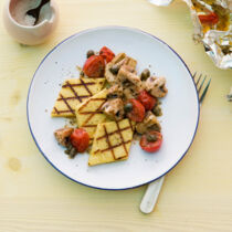 Gschmorte Keiblbackerl mit Polenta und Plutzer