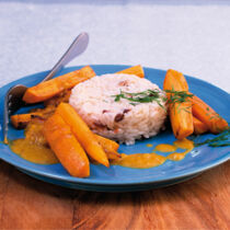 Scharfe Schmormöhren in Erdnusssauce mit Reis