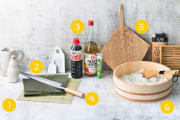 Zutaten und Utensilien für die eigene Sushi-Küche