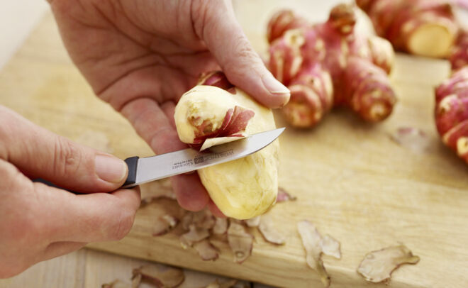 Im rohen Zustand könnte man Topinambur wegen ihrer Form glatt mit einer Ingwerknolle verwechseln. Allerdings gibt es die Topinambur in verschiedenen Farbtönen. Die Schale kann sowohl rötlich, als auch beigebräunlich sein. Es gilt: Je heller die Farbe, desto feiner ist der Geschmack. Spätestens beim Geschmackstest wird der Unterschied dann aber doch klar: Die Topinambur schmeckt leicht süß und wird ähnlich wie die Kartoffel verwendet, schmeckt als cremige Suppe, im Eintopf geschmort oder gebraten. Aber auch roh kann man die Topinambur essen.