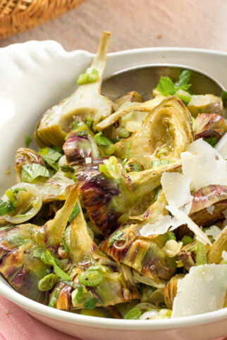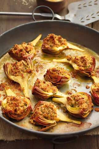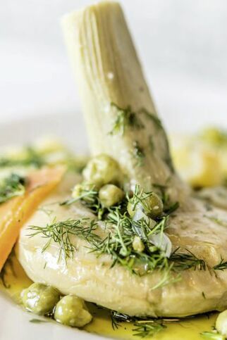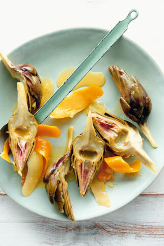 Gemeint ist hier das klassische Form, die Artischocke zu essen, bei dem die Blätter der gekochten Distelknospe gezupft, in Sauce getaucht und mit den Zähnen abgelutscht werden. Bei uns fühlt man sich dabei gerne französisch und nimmt z. B. die dicken, bis zu 500 g schweren Artischocken aus der Bretagne dazu – weil einfach mehr dran ist. Typischer ist diese Art zu essen für den Mittelmeerraum, wo pro Person ein paar der im Süden eher üblichen kleineren, länglichen, um die 150 g schweren Sorten in den Topf kommen. Sind diese jung und klein genug (pro Stück etwa 50 g), können sie im Ganzen gebraten, geschmort oder frittiert werden. Dann gibt es aber keinen Sud, aus dem sich sonst eine feine Suppe kochen ließe.