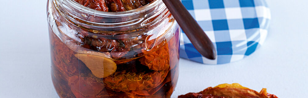 Oft werden diese Tomaten fertig in Öl eingelegt, das lässt sich aber auch selbst machen. Dazu "rohe" Trockentomaten (gibt’s in guten Supermärkten oder im Italienladen) 2 Stunden in einer Mischung aus 3 Teilen Wasser und 1 Teil Rotweinessig einlegen, abgetropft in Gläser schichten (wer mag, gibt noch Knoblauch, Kapern und Basilikum dazu) und mit bestem Olivenöl bedecken. Zuschrauben und 1 Woche durchziehen lassen.