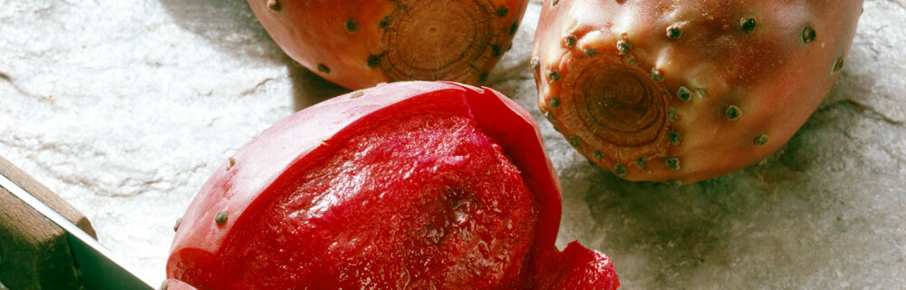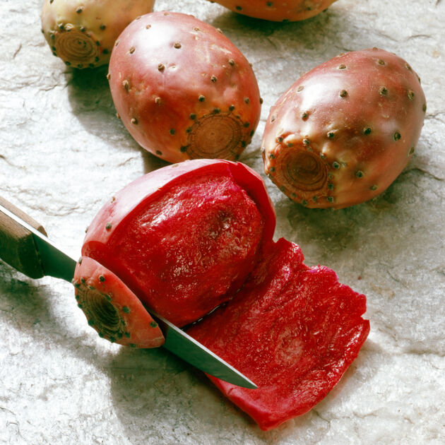 Der Ursprung der Kaktusfeige, die im gesamten tropischen und subtropischen Klima gedeiht, liegt in Mexiko. Spanische Seefahrer brachten die Tropenfrucht im 16. Jahrhundert in den Mittelmeerraum. Nach wie vor ist Mexiko der größte Produzent, aber auch in Mittelamerika, Kalifornien, Australien, Südafrika, auf Sizilien, in Spanien, Israel, Algerien, Tunesien und Ägypten wird sie angebaut. Aus gelben Blüten wachsen die gänseeigroßen bis birnenförmigen, rund 200 Gramm schweren Früchte heran. Je nach Sorte ist ihre drei bis fünf Millimeter dünne Schale gelblich, lachsfarben, dunkelbraun, rot oder grün. Die Dornenhärchen, die sich auf der Schale befinden, werden abgebürstet, bevor die Kaktusfeigen in den Handel kommen. Dennoch gilt: Besser vorsichtig sein oder Küchenhandschuhe tragen, da gerne noch ein paar Dornen übrig sind und sich in die Haut bohren können. Eine Ausnahme bildet die "Burbank’s Spineless", eine stachellose Kaktusfeige. Das Fruchtfleisch, dessen süßsäuerlicher Geschmack ein wenig an Melone oder Birne erinnert, ist gelb, rosa oder rot gefärbt. Die kleinen schwarzen Samen können mitgegessen werden. In Mexiko kommen auch die jungen Blätter der Kaktusfeige auf den Tisch.
