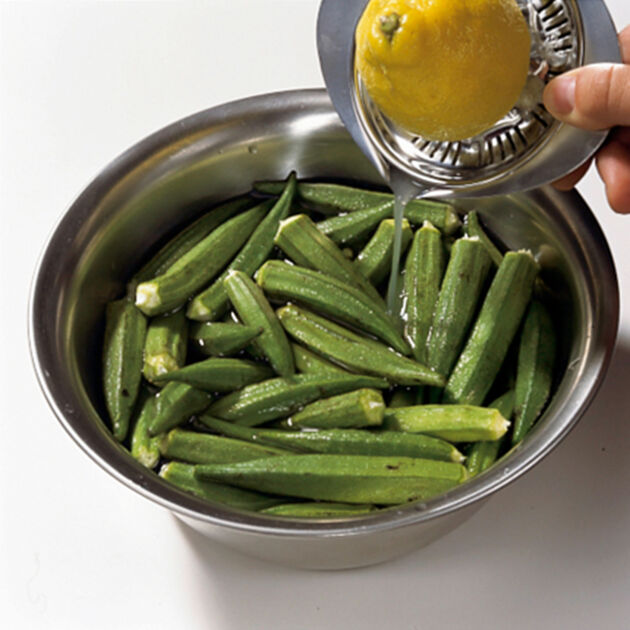 Okras haben ähnlich wie Chilies und Paprikaschoten kleine, weiße Kerne, die mitgegessen werden können. Ihre Schale ist grün bis dunkelgrün und mit einem weichen Flaum umgeben. Okraschoten enthalten eine schleimige Substanz, die sich gut zum Eindicken von Suppen und Eintöpfen eignet. Durch Blanchieren in Salzwasser oder das Einlegen in Zitronenwasser kann man das Absondern der Flüssigkeit vermeiden.