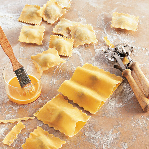 Es gibt Ravioli frisch, getrocknet und in Dosen (ja, manche mögen das!). Am besten sind sie natürlich selbst hergestellt: Dazu wird der Nudelteig zu einem großen, dünnen Rechteck ausgerollt. Eine Hälfte des Teiges wird mit kleinen Portionen der Füllung belegt, die Zwischenräume mit Wasser oder verquirltem Ei benetzt. Danach wird die zweite Hälfte des Teiges darübergeklappt, in den Zwischenräumen angedrückt und mit einem Messer, Ravioli-Rädchen oder -Ausstecher geschnitten. Es gibt auch Ravioli-Formen, durch die die Füllungen gleichmäßig angeordnet und alle Ravioli gleichmäßig geschnitten werden. Hier findest du unserer Schritt-für-Schritt-Anleitung für selbstgemachte Ravioli.