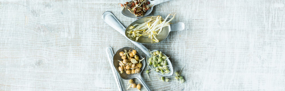 Sprossen sind mittlerweile – bereits fertig gekeimt – in den Gemüseabteilungen der Supermärkte erhältlich. Wer punkto Qualität sicher gehen will, der züchtet seine Sprossen aber einfach selbst. Zum Keimen geeignet sind unbehandelte Getreide-, Kräuter- oder Gemüsesamen (im Bio- Laden oder Reformhaus erhältlich). Manche, etwa Senf, Leinsamen oder Kresse, sondern allerdings nach dem Anfeuchten Schleim ab, der die Schlitze des Keimapparats verstopfen würde. Darum verteilt man solche Samen am besten auf einem flachen Teller und besprüht sie drei- bis viermal täglich mit Wasser. Hülsenfrüchtesprossen sollte man vor dem Verzehr blanchieren.