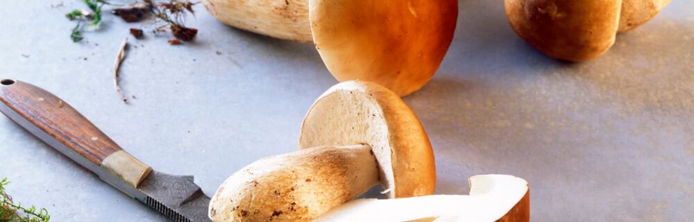 Der große, festfleischige Steinpilz mit dem hell- bis dunkelbraunen Hut und den gelblich-grünen Röhren zählt zur Gattung der Dickröhrlinge. Von Juli bis Oktober (Hauptzeit: September und Oktober) finden Sie ihn in Nadelwäldern unter Fichten und Kiefern, aber auch in Laubwäldern auf Moos und Heidekraut. Zu erkennen ist der Steinpilz an seinem dicklichen weißen Stiel, er riecht nach frischer Erde und seine Schnittkante verfärbt sich nicht bläulich. Der "schlanke" Pilz besteht zu etwa 90 % aus Wasser, enthält viele Ballaststoffe, die Vitamine B und D sowie viel Eiweiß. Verwechslungsgefahr besteht mit dem leicht giftigen Gallenröhrling (Bitterling), der im jungen Zustand dem Steinpilz sehr ähnlich sieht; seine Röhren werden jedoch bald leicht rosa und verfärben sich bei Druck bräunlich. Sein heller Stiel ist von einem bräunlichen "Netz" überzogen, das sehr viel deutlicher ist als beim Steinpilz. Durch eine Leckprobe am frisch aufgeschnittenen Fleisch des Gallenröhrlings kann der bittere Geschmack sehr leicht festgestellt werden! Wer danach ausspuckt, dem kann aber nichts passieren.