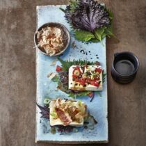 Ingwer-Linsentaler mit Kohle-Hummus und Limetten-Wildkräuter-Salätchen