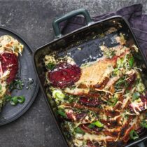 Vegane Speckknödel mit Pflaumenfüllung, Burgunderrahmund cremigem Bohnensalat